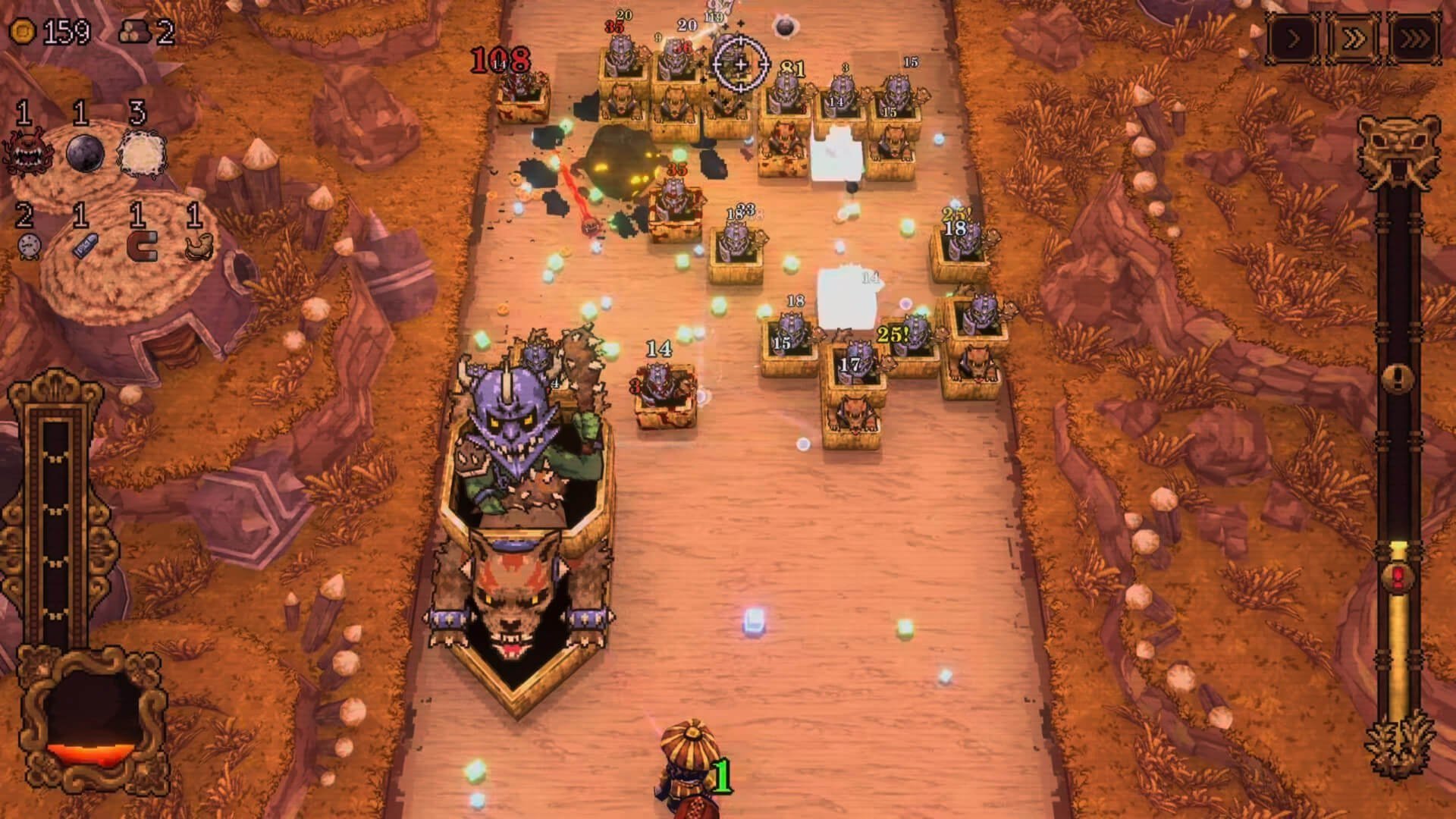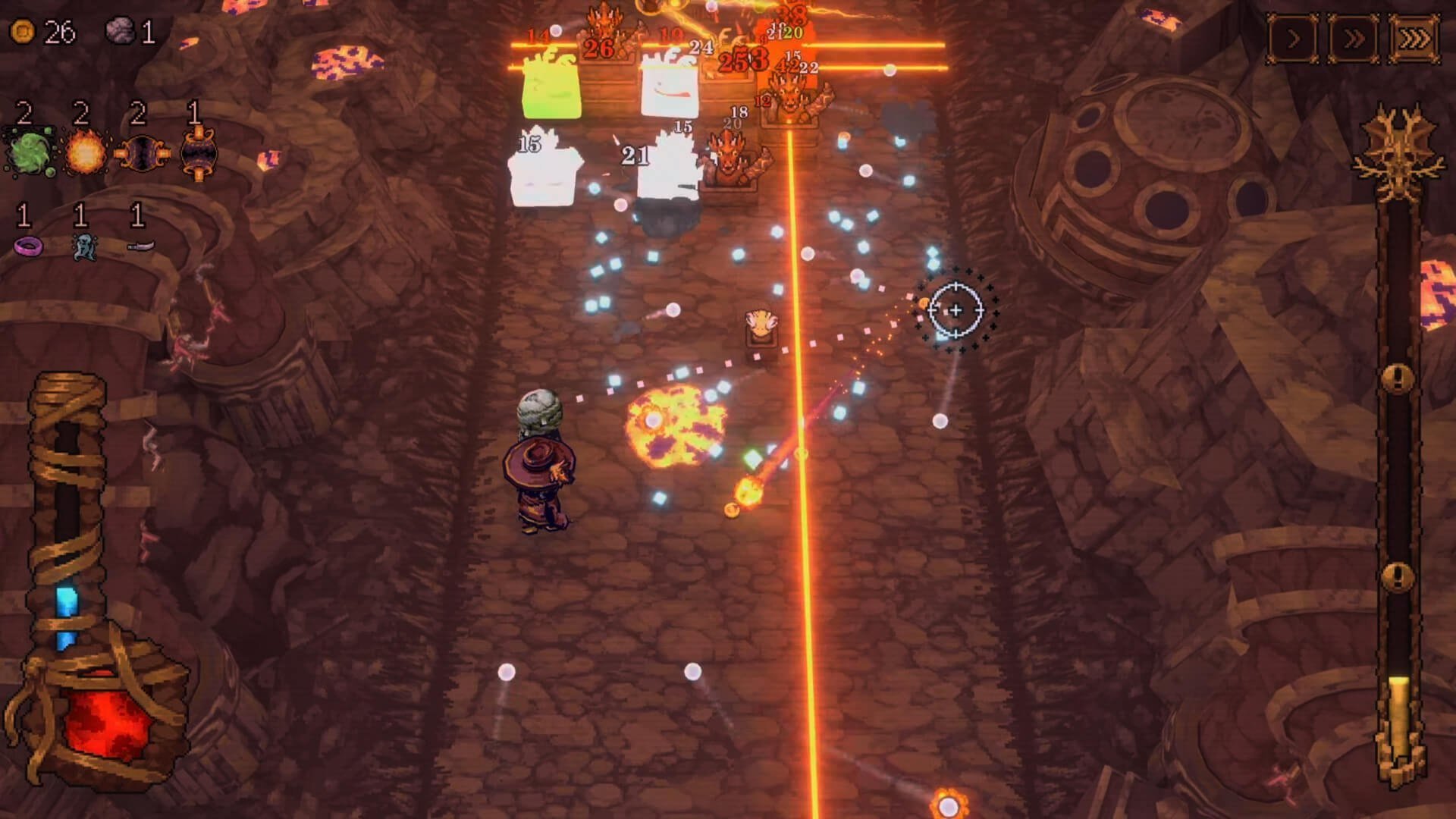 Visually, BALL x PIT is a pixel-popping palette, Sun’s solo strokes (aided by Luka Parascandalo’s pixel portraits) painting a post-apoc pizzazz that’s as vibrant as a vending machine vandalized by Van Gogh: Ballbylon’s bottomless brink bristles with barren badlands of boulder brutes in burnt siennas, frozen fjords flickering with frosty flicks of forget-me-not nips, and savage sylvan snares in emerald enigmas where emerald enemies emerge from emerald eaves. Balls bounce with bouncy brilliance: a Flame Flinger flares with fiery fractals, fusing into Frosty Fusions that frostbite frames with fractal filigrees, all amid arenas that animate with arcade alacrity, enemies exploding into effervescent embers, bosses bloating into behemoth ballets that blot the bower. The art direction, a “voguish spin on Atari aesthetics” with high-res fonts and swirling swirls (toggleable for the twitchy), twirls tension into tapestry, though dense drops occasionally drop frames like dropped balls, a “heavy particle hitch” that’s hitched but hardly halting.