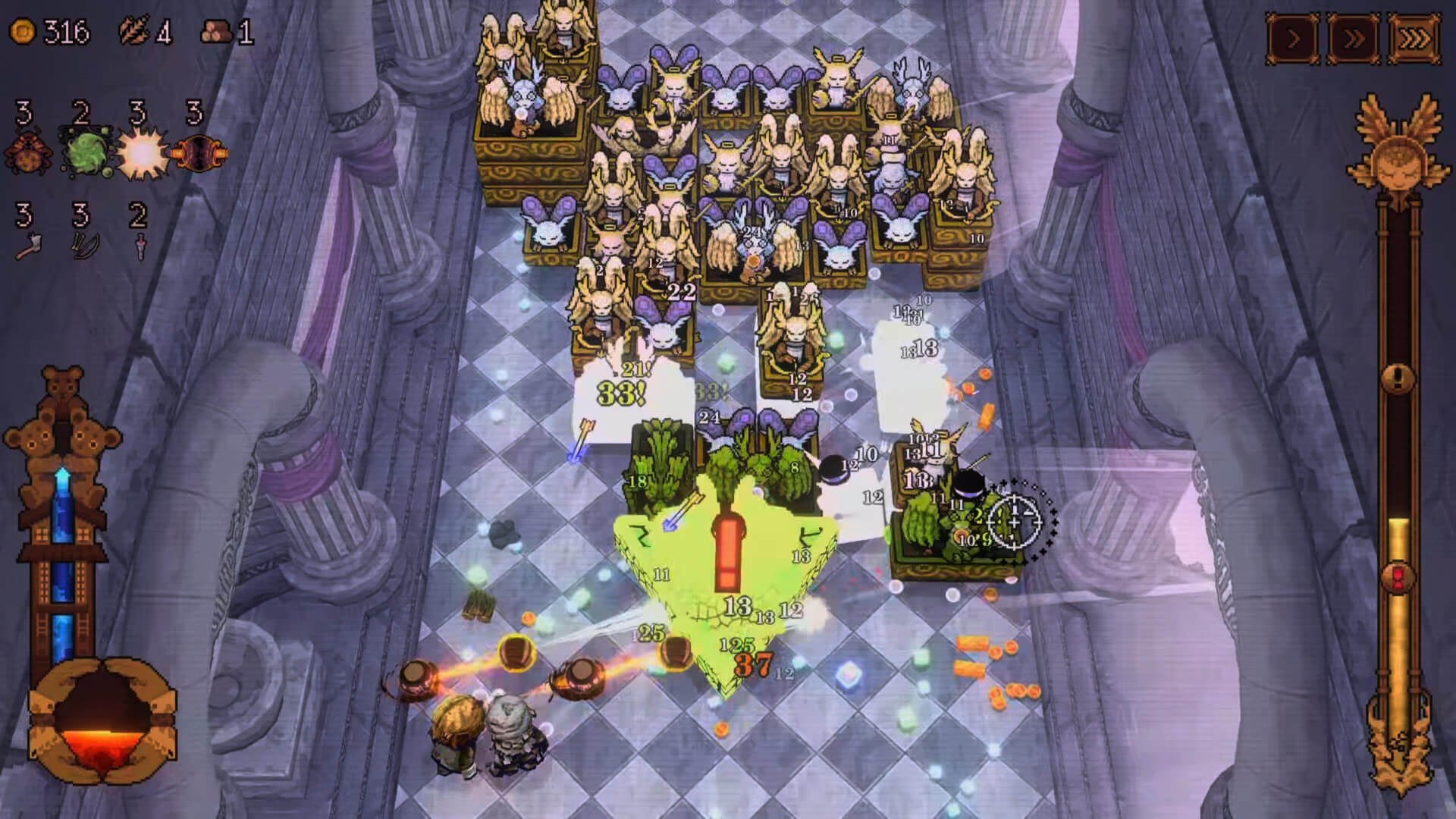 Base-building bridges the bounces: haul hauls back to New Ballbylon to blueprint buildings (70+ blueprints, from Ball Barracks that buff ball births to Hero Huts that hasten hires), assigning idle idlers to auto-arcane arcs that accrue arcane amalgams, farm fusion filaments in fungal forges, or forge forges for faster fusions. It’s Loop Hero‘s looping lite with Stardew‘s settler spice, where a well-walled workshop whips up wonder weapons while you whip through the pit. Boss brawls balloon the bedlam: screen-filling behemoths like a boulder boss that births boulder barrages, demanding dodge-dance dodges and dart-dispatch darts to dismantle their dread. The loop’s longevity lies in its layers: NG+ nadir nips strip starters for steeper stakes, with “endless” eternities for elastic elites. Quirks? The grind’s “grindy grind” gates gates with gatekeeping gruel, and enemy echoes echo too echoingly in mid-pit monotony, a “brainless barrage” that barrages boredom for the ball-blind. Yet, it’s this unyielding upward arc, balls beating beasts into butter, that beats boredom, a bouncy behemoth that’s “one of the most engaging” indies, as enthusiasts enthuse.